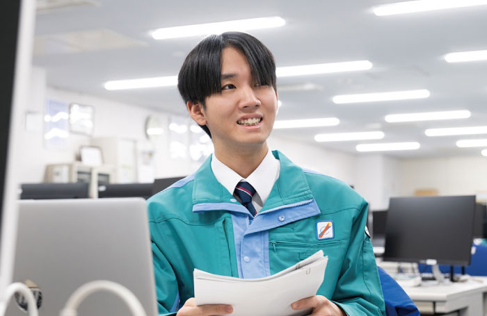 学生時代に電柱に関わる仕事に興味を持ち、先生に相談した際に勧められたのが当社でした。業務内容が自分の希望に合っており、福利厚生の充実も決め手になりました。現在は「許認可工事に伴う諸願届業務」を担当し、電柱新設に必要な申請書の作成や取りまとめを行っています。覚えることは多いですが、その分やりがいも大きいです。